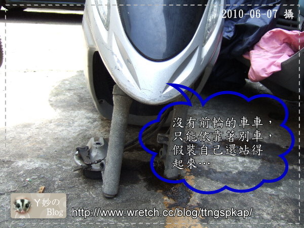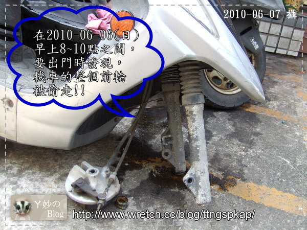 在8~10點間,當我跟昌ㄚ要出門買早餐時,一出大門,兩人愣住,昌ㄚ的機車前輪整個不見了!!